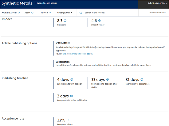 期刊官网:https://www.sciencedirect.com/journal/synthetic-metals