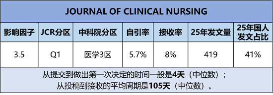 《JOURNAL OF CLINICAL NURSING》创刊于1992年,出版周期为Semimonthly(半月刊),由WILEY出版社出版。