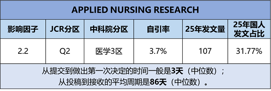 期刊官网:https://www.sciencedirect.com/journal/applied-nursing-research