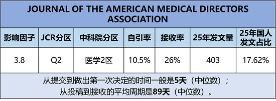 《JOURNAL OF THE AMERICAN MEDICAL DIRECTORS ASSOCIATION》创刊于1999年,出版周期为Monthly(月刊),由Elsevier出版社出版。