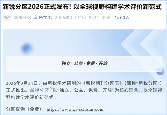 由新锐学术研制的《新锐期刊分区表》(简称“新锐分区”)正式推出。新锐分区以“独立、公益、免费、开放”为核心理念,以全球视野构建学术评价新范式。