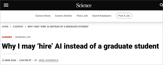 近期,Science在职场栏目发表了一篇引人深思的随笔,标题为Why I may ‘hire’ AI instead of a graduate student。