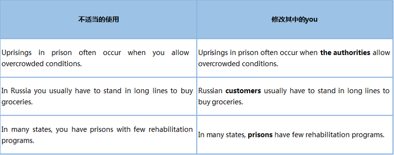 虽然在正式的文章中使用第二人称是没有本质上的错误的。但是大多数读者认为,you的使用会显得文章不够正式。并且在提出意见或者给出研究计划时使用会显得咄咄逼人,很容易给读者带来不悦。如: