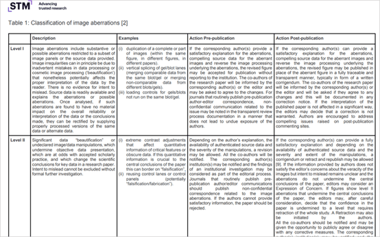 2021年,爱思唯尔、威立、斯普格林·自然等8家国际大型学术期刊联合起来,共同制定如何发现和处理可疑图像或数据的指导方案,将图片不当处理划为三个级别,从第一级——论文中的一些图像被修改,或以不影响研究结论的方式美化——到第三级,包括严重的图像操纵,有模糊或捏造的明确证据,并有误导的意图。