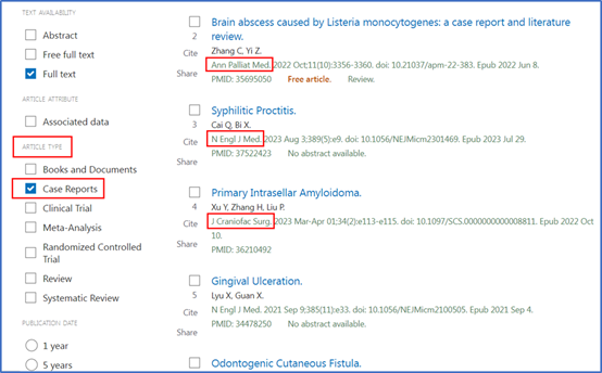 然后按照“Article type: Case Reports”筛选文章,查看已发表文章的期刊,从而选择适合文章及作者要求的期刊。
