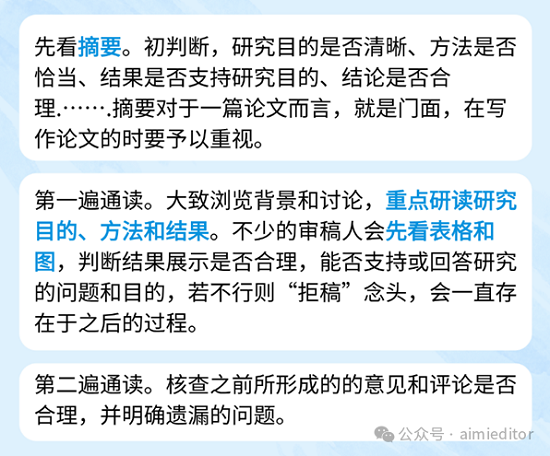审稿人通常会按以下顺序来审稿:阅读摘要,初判断质量→通读第一遍,研读图表,记录笔记,形成初步意见→通读第二遍,核查记录,并确定意见→形成审稿报告。