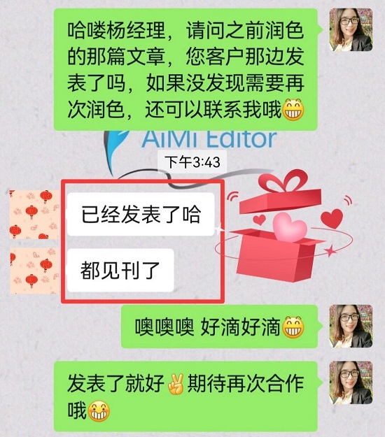企业朋友推荐埃米给自家客户,文章初稿润色后顺利发表。
