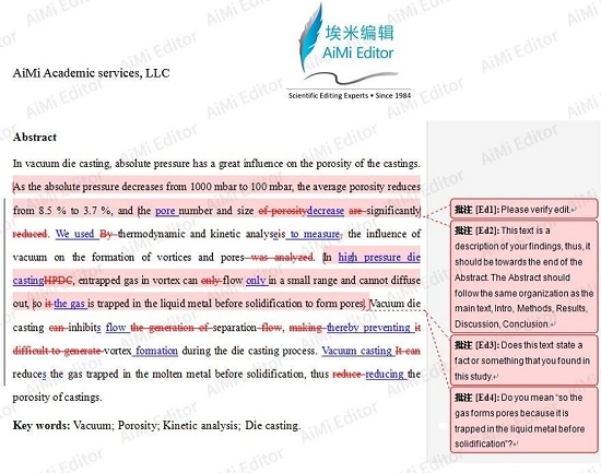 通常,润色机构给作者返回的稿件中会包含修订痕迹和批注。以埃米编辑为例,专家编辑不仅会对语言进行润色(包括语法、逻辑、模糊性等),还会检查文章科学性,做出批注提示或修改建议。