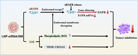 本研究开发了一种基于已上市Onpattro®脂质纳米颗粒(LNP)的siRNA共递送体系,通过共封装小分子药物庆大霉素(GM)与siRNA,显著增强siRNA的内体-溶酶体逃逸效率。该LNP-siRNA/GM体系利用GM诱导活性氧生成、磷脂积聚及内体膜膨胀破裂的特性,实现siRNA高效释放,同时保持LNP的物理稳定性。结果显示,该策略将EGFR基因的沉默效率由约56%提升至约81%。在细胞和动物模型中,LNP-siRNA/GM通过siRNA与GM的协同作用,下调VEGF和CXCL12表达,抑制肿瘤生长和血管生成,并诱导肿瘤细胞凋亡。该研究为提高siRNA的内体逃逸与基因敲降效率提供了有效策略,并显著增强了基于LNP的癌症治疗效果。
