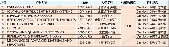 目前WoS核心数据库中On Hold状态的期刊共计9本,均为SCIE期刊,如下表: