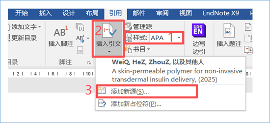 Word的【引用】功能中虽然内置了APA、MLA样式,也可以通过【插入引文】-【添加新源】,手动录入文献信息。