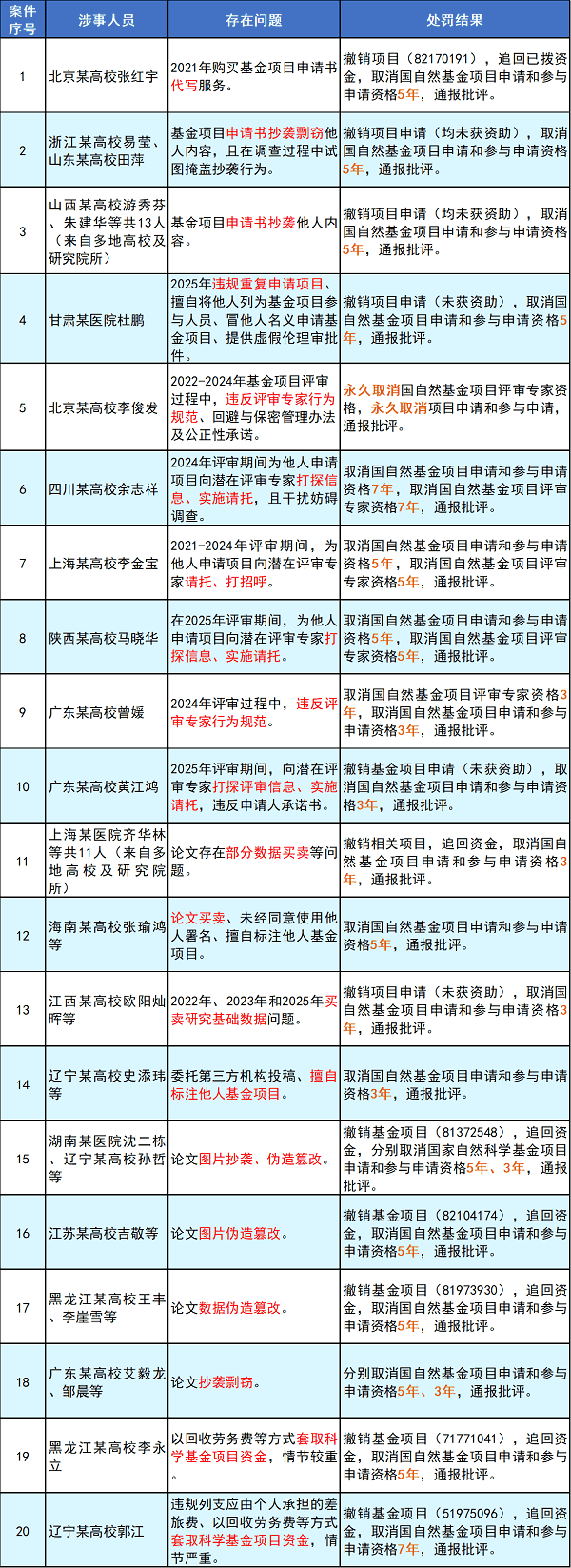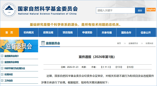 1月23日,国家自然科学基金委员会官网发布《案件通报(2026年第1批)》,对一批在项目申请、评审及实施过程中存在科研不端行为的单位和个人进行处罚。