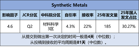 期刊官网:https://www.sciencedirect.com/journal/synthetic-metals