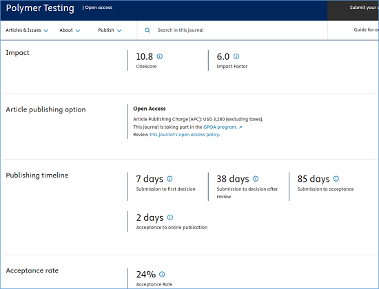 期刊官网:https://www.sciencedirect.com/journal/polymer-testing