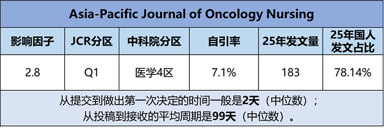 期刊官网:https://www.sciencedirect.com/journal/asia-pacific-journal-of-oncology-nursing