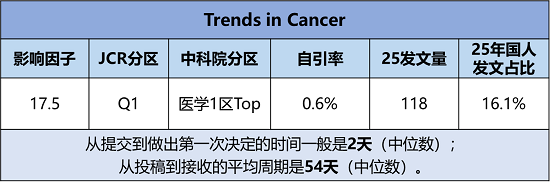 《Trends in Cancer》创刊于2015年,出版周期为Monthly(月刊),由CELL PRESS出版社出版。