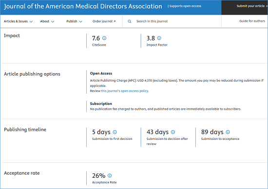 《JOURNAL OF THE AMERICAN MEDICAL DIRECTORS ASSOCIATION》创刊于1999年,出版周期为Monthly(月刊),由Elsevier出版社出版。