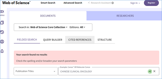 举例:搜索CHINESE CLINICAL ONCOLOGY期刊,页面显示找不到搜索结果。