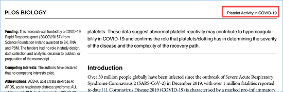 分析:Title是一个完整的陈述句,Running Title从中提取两个核心关键词,COVID-19和Platelets(血小板),并将具体结论性表述“induces a hyperactive phenotype in”概括为更中性的“Activity”,形成简洁的名词短语。这样既保留研究的核心要素,又避免了在短标题中呈现具体结论。