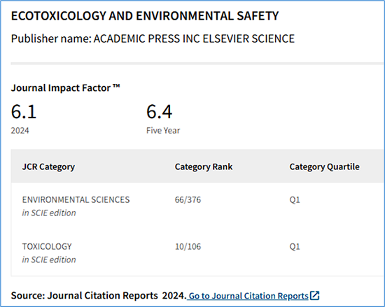 恭喜经埃米编辑参与润色的文章,成功发表在SCI期刊:Ecotoxicology and Environmental Safety,JCR分区:环境科学/毒理学Q1,2026新锐期刊分区:环境科学与生态学2区Top,IF 6.1。