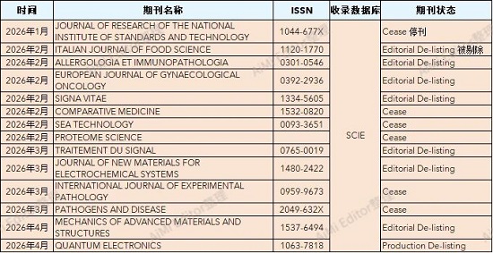 科睿唯安官网发布了2026年4月数据库收录变化文档,此次更新共有13本期刊被剔除(其中8本之前为On Hold),分别是2本SCIE、11本ESCI期刊。8本期刊改名,增加了14本ESCI期刊。文末附表格下载。