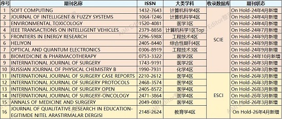 目前WoS核心数据库中On Hold状态的期刊共计16本,其中包含10本SCIE期刊、6本ESCI期刊,如下表: