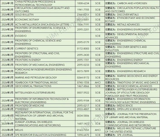 2026年,有49本ESCI收录的期刊(4月有11本)被剔除;12本期刊仅更改了名称(4月有4本);另有69本被ESCI新增收录的期刊(4月新增14本)。期刊详情请下载附表查看。